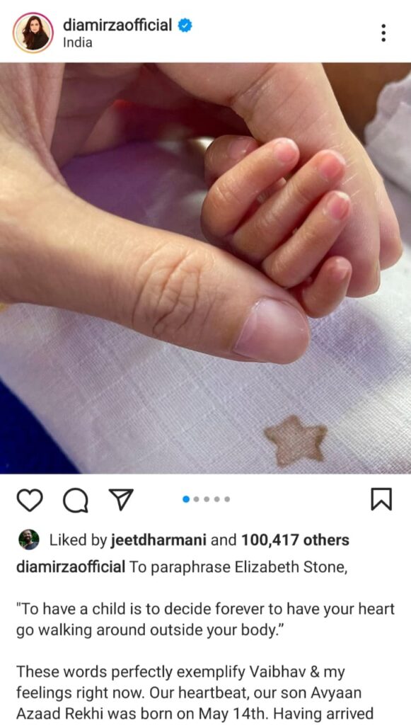 Dia Mirza has announced the news on her Instagram account and said that the little one was born on May 14 and is currently gaining strength in a Neonatal ICU.