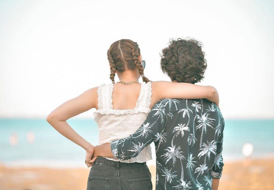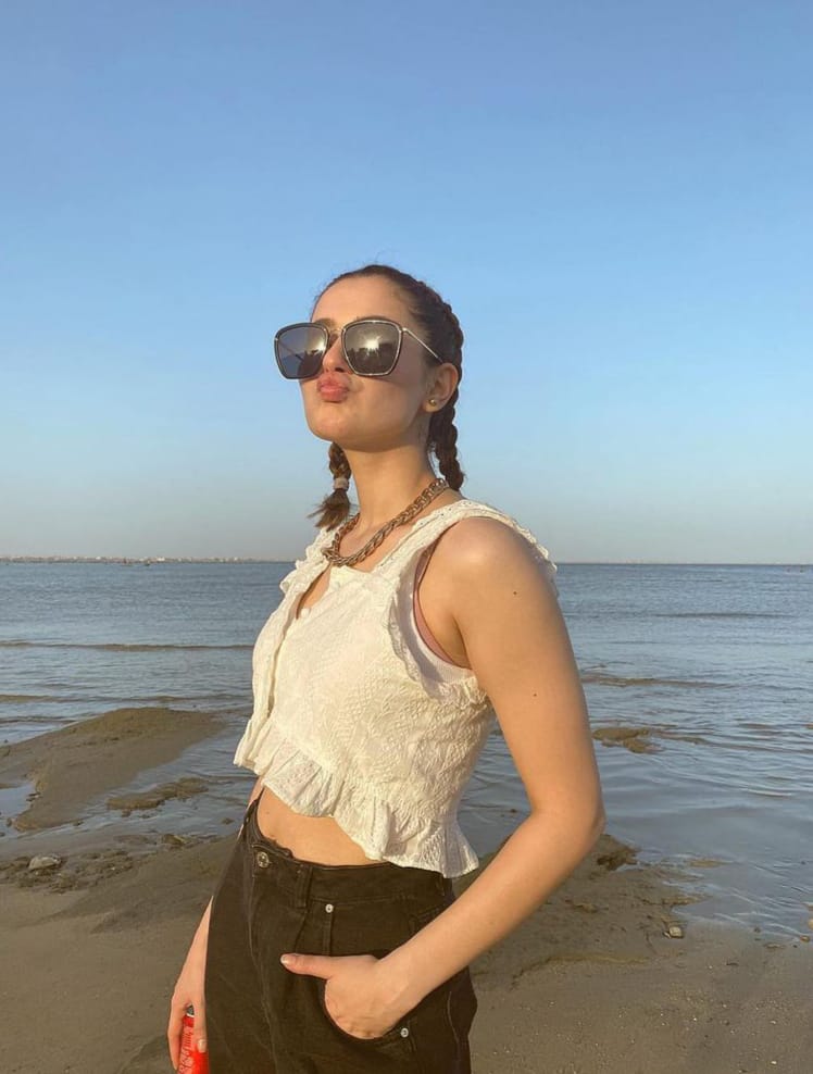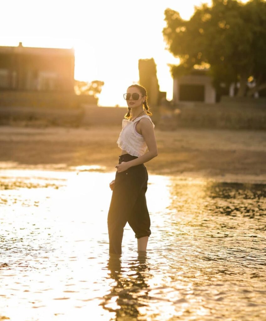 The tempting avatar of Hania Aamir is rasing the heat on the beach while wearing a white crop shirt with black jeans and with classy black sun shades and french braided hair.