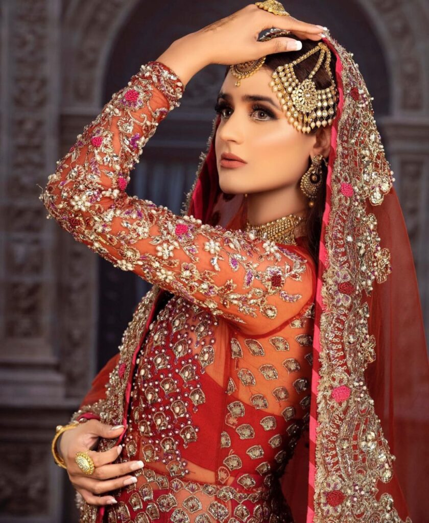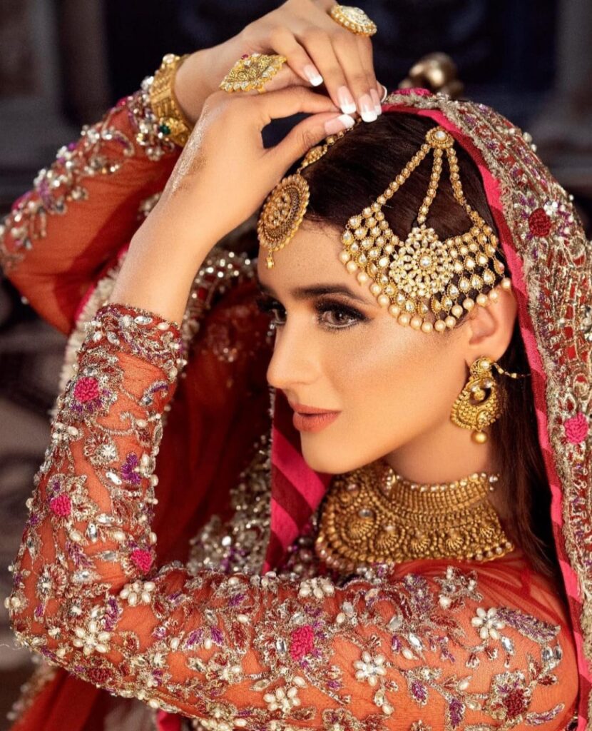 According to details, the actress has modeled for a makeup brand in red bridal wear. She is wearing bridal ensemble by fashion designers Zubia Zainab. Her bridal makeover was done by “Makeovers by Amaima”.